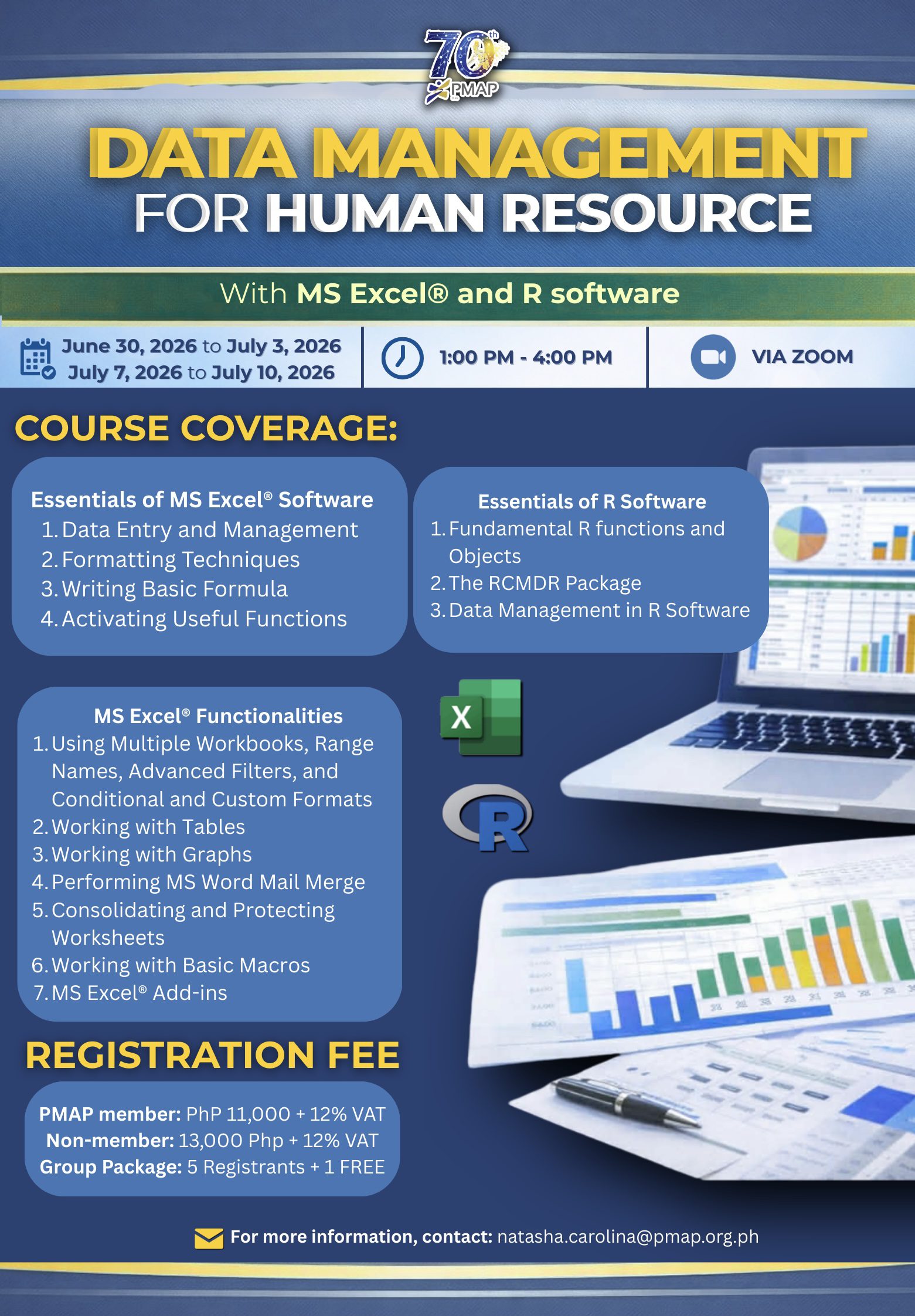 Join us for this specialized module designed for HR professionals and people managers, on Statistics for Human Resource Management: Data Management for Human Resources with MS Excel®, R Software, and Jamovi this June 30 to July 3; and July 7 to July 10, 2026 from 1:00 PM to 4:00 PM via Zoom.